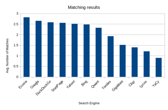 Of the three, Ecosia was the most different from pure Bing with an average edit distance of 8. DuckDuckGo was the second most different with edit distance of 7, followed by Yahoo! with a distance of 5.
